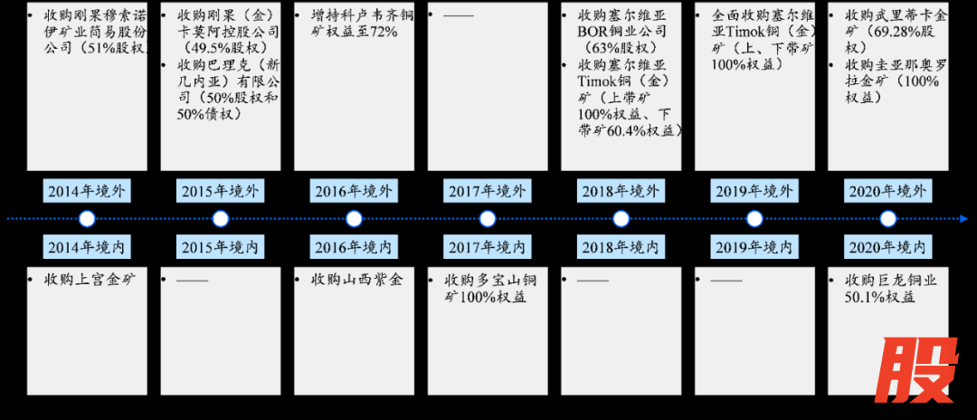 2014年,收购刚果穆索诺伊矿业简易股份公司51%股份,成为其控股股东,之后从华友钴业收购21%股份,共计持有该公司 72%股权,成功进入非洲科卢韦齐铜矿项目。2015年,在铜价、金价低谷期,公司以低价策略大举收购,完成波格拉金矿、卡莫阿铜矿收购,并参与了艾芬豪公司、恩科维铂业增发,完成诺顿金田退市。2018年,收购塞尔维亚RTB Bor铜矿63%股权。2019 年,收购Nevsun 100%股权,旗下拥有塞尔维亚Timok铜金矿及非洲厄立特里亚在产矿山Bisha铜锌矿。2020年,收购武里蒂卡金矿、西藏巨龙铜业50.1%权益、圭亚那奥罗拉金矿100%权益。