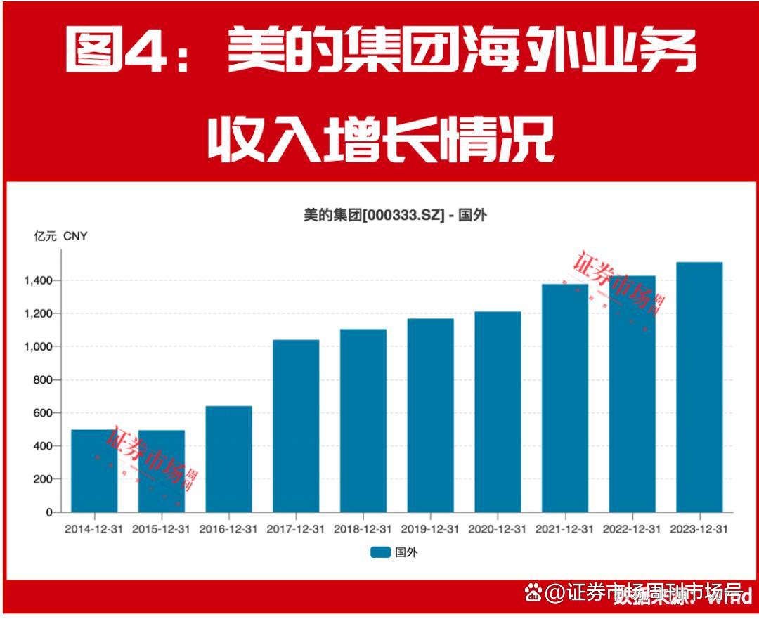 财报显示,2022年、2023年, 美的集团的海外业务都已经占到全部营收的40%以上,分别为1426.45亿元、1509.06亿元,而且近些年来海外业务在持续增长。(见图4)